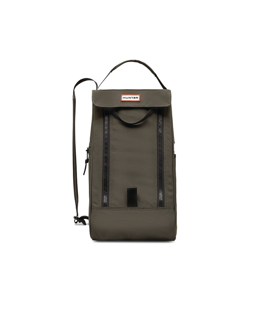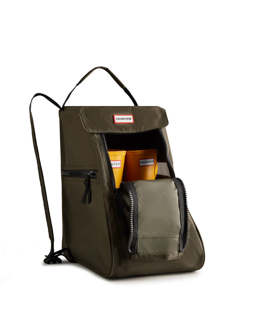 A medium-sized boot bag crafted from a durable polyester shell. Designed to carry short Hunter boots, the travel boot bag features a wide double zip opening, an exterior slip pocket and mesh panel. A practical design, a top handle and adjustable shoulder strap allow it to be easily carried.