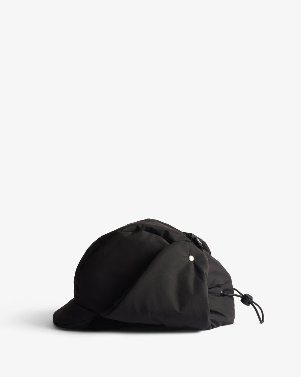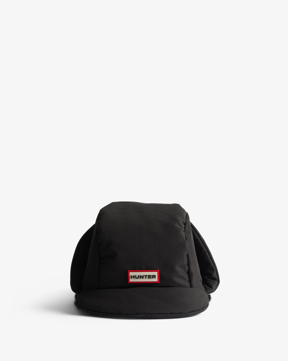 Rosyth Ripstop Puffer Trapper Hat The Rosyth Ripstop Trapper Hat offers warmth and wind resistance in colder months. Designed with a puffer-style crown and faux shearling ear flaps, it features adjustable fastening and Hunter branding on the front.