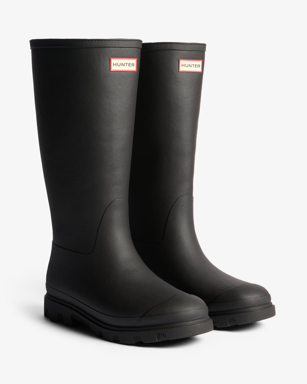 Introducing the newest addition to the Hunter family, our fully waterproof Unisex Downpour Insulated Tall Boot. With a sleek upper design and a lightweight moulded outsole, the unique tread has taken influence from natural shapes found in landscapes. Handcrafted and finished with a heritage topbind and insulated lining, this unisex winter black riding boot has been engineered to have a more modern and voluminous calf fit.